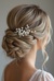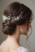 The image is a close-up of the back of a woman's head, showing her hair styled in an elegant updo. The hair is styled in loose curls that are swept to the side and secured with a hair accessory. The accessory is made up of small white pearls and crystals, giving it a luxurious and elegant look. The woman is wearing a white wedding dress with a lace overlay, and the background is blurred, making the hair accessory the focal point of the image.